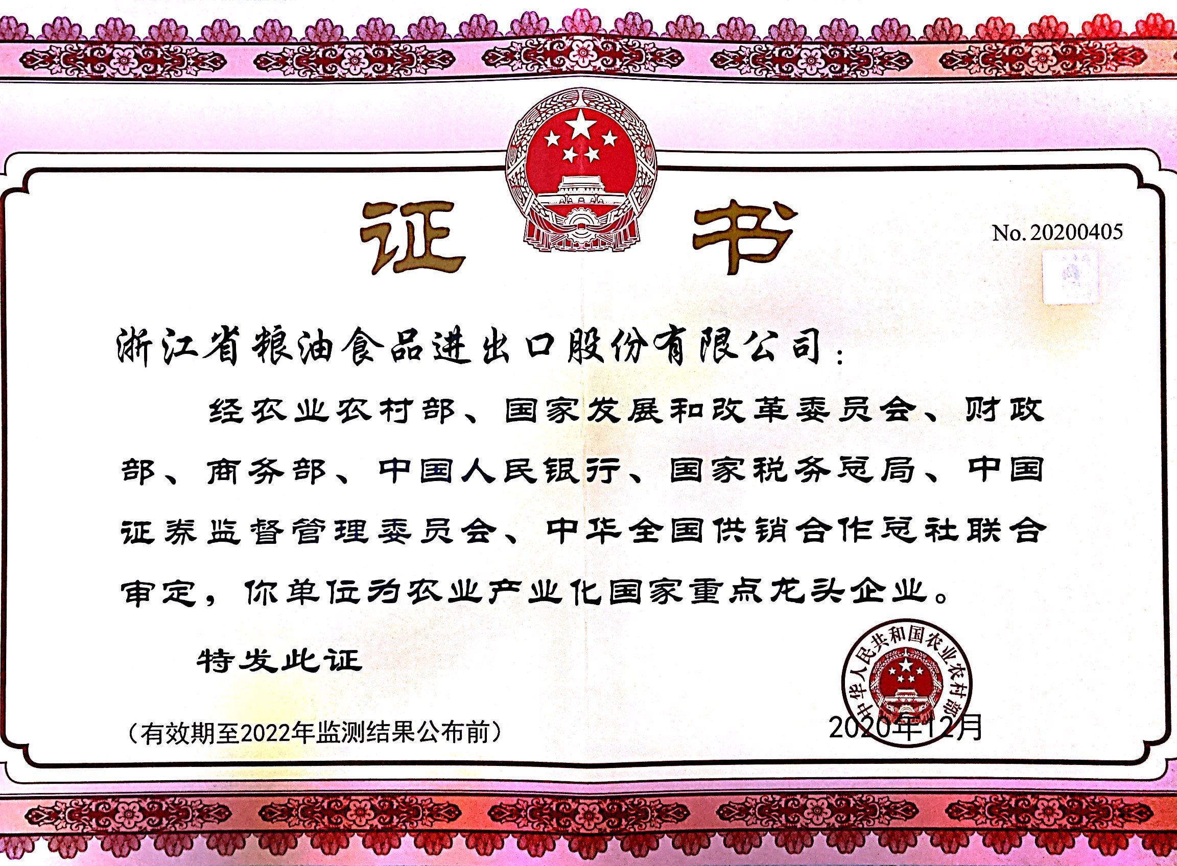公司與寧波天韻公司通過第九次農業產業化國家重點龍頭企業監(jiān)測復評